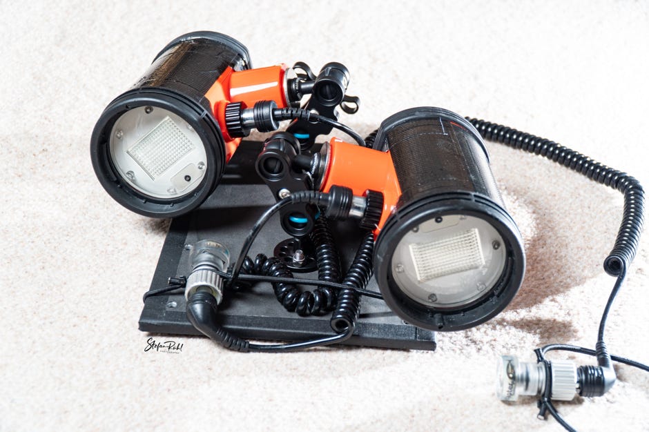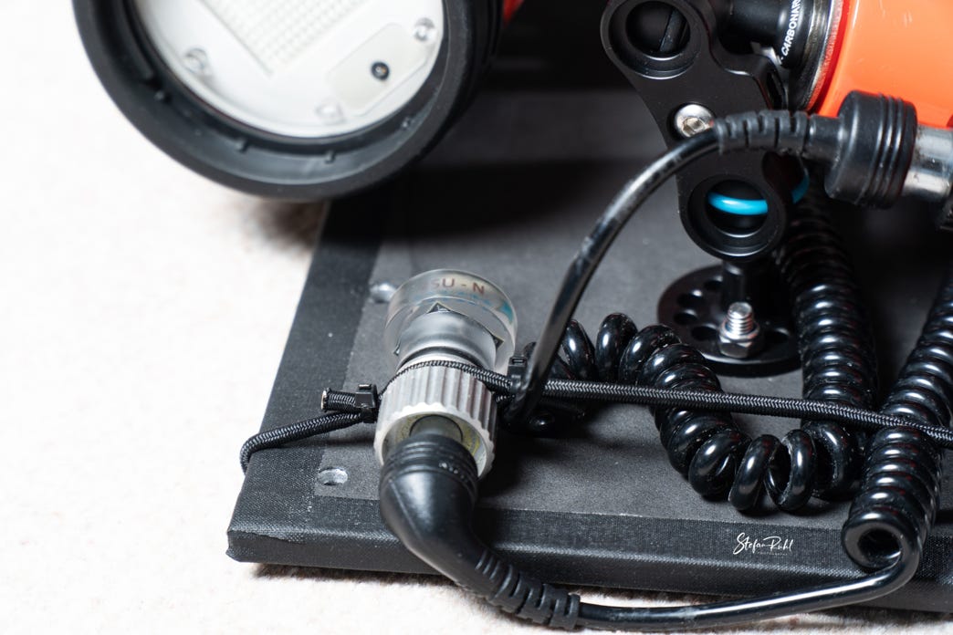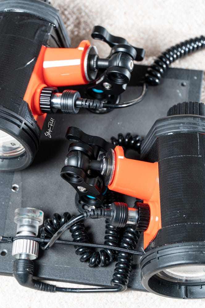 Ich habe mir eine Trägerplatte für 2 Nikonos SB105 Blitze gebaut. Am linken Blitz ist das Kabel mit dem Sensor, welches mein Buddy an der Hand trägt. Der Sensor des rechten Blitzes liegt direkt vor dem linken Blitz und wird von diesem ausgelöst.