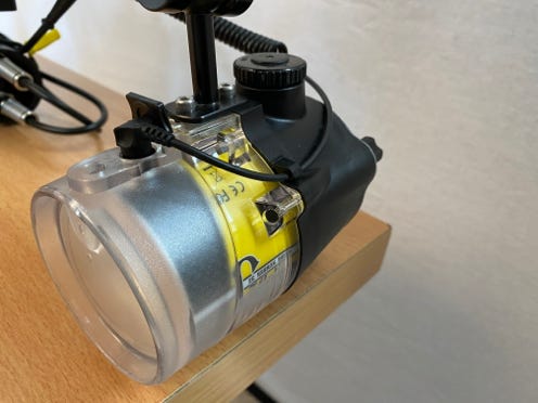 Hier ein NIKONOS Blitz auf einem Rollei Stativ und am Ende des Kabels der HW Sensor.