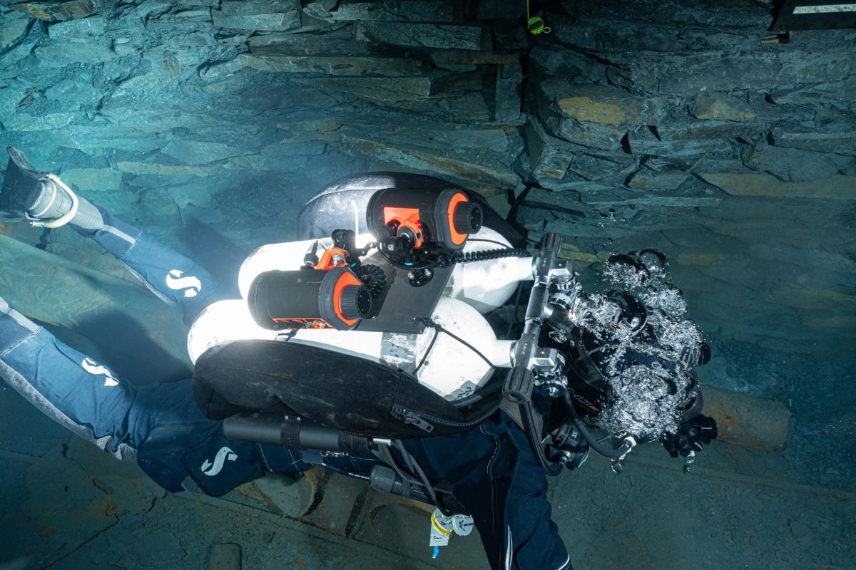 Die Herausforderung besteht nun, das Set auf den unterschiedlichsten Tauchgerätes fest und sicher zu positionieren. Der erste Versuch war auf einer D12. Hier habe ich das Set mit Gummiseil befestigt.